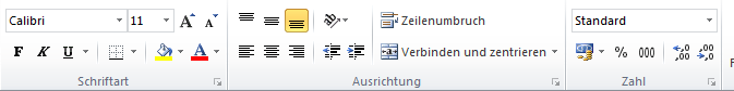 Eine gute Auswahl an Möglichkeiten der Zellformatierung findet sich im Register Start in den Gruppen Schriftart, Ausrichtung und Zahl.
