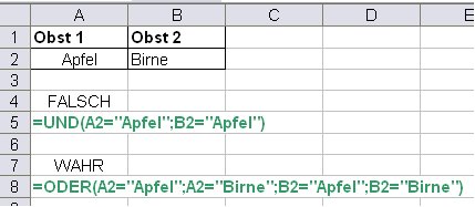 Im o. a. Beispiel gibt die Funktion UND als Ergebnis FALSCH zurück, da nicht beide Begriffe in den Zellen "Apfel" sind. Die Funktion ODER gibt WAHR zurück, da entweder "Apfel" oder "Birne" in einer der Zellen steht.